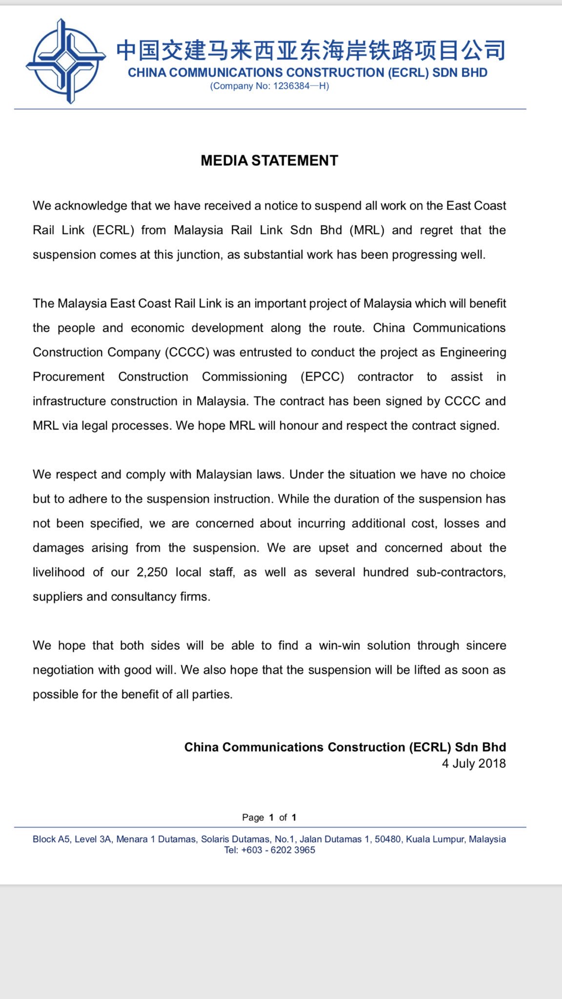 Statement By China Communications Construction Ecrl Sdn Bhd Business Today
