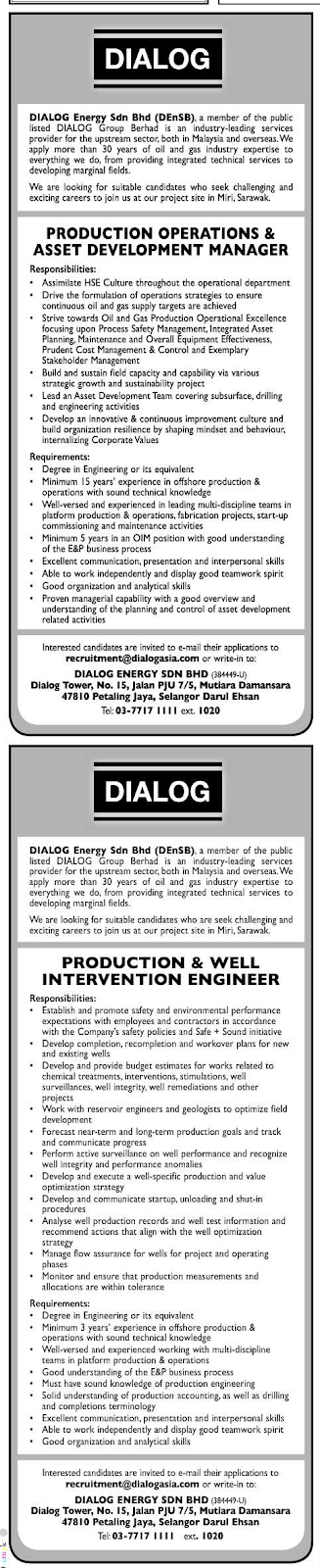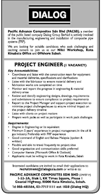 Oil Gas Vacancies Project Engineer Dialog Sabah