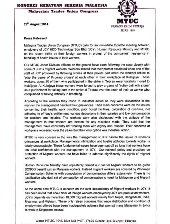 Mtuc Calls For Tripartite Meeting On Kulaijaya Strike Malaysian Trades Union Congress