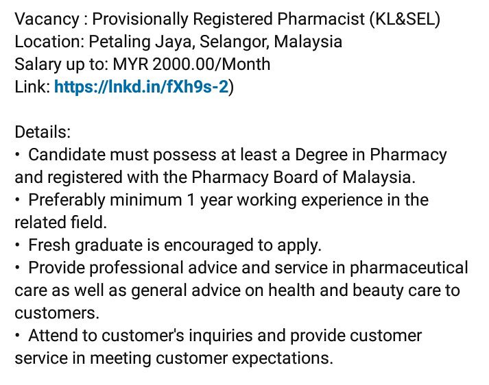 Jobcart On Twitter Vacancy Provisionally Registered Pharmacist Kl Sel Location Petaling Jaya Selangor Malaysia Salary Up To Myr 2000 00 Month Link Https T Co Uoomjespaz Jobcart Pharmacist Pharmacy Customerservice Vacancies Jobopening