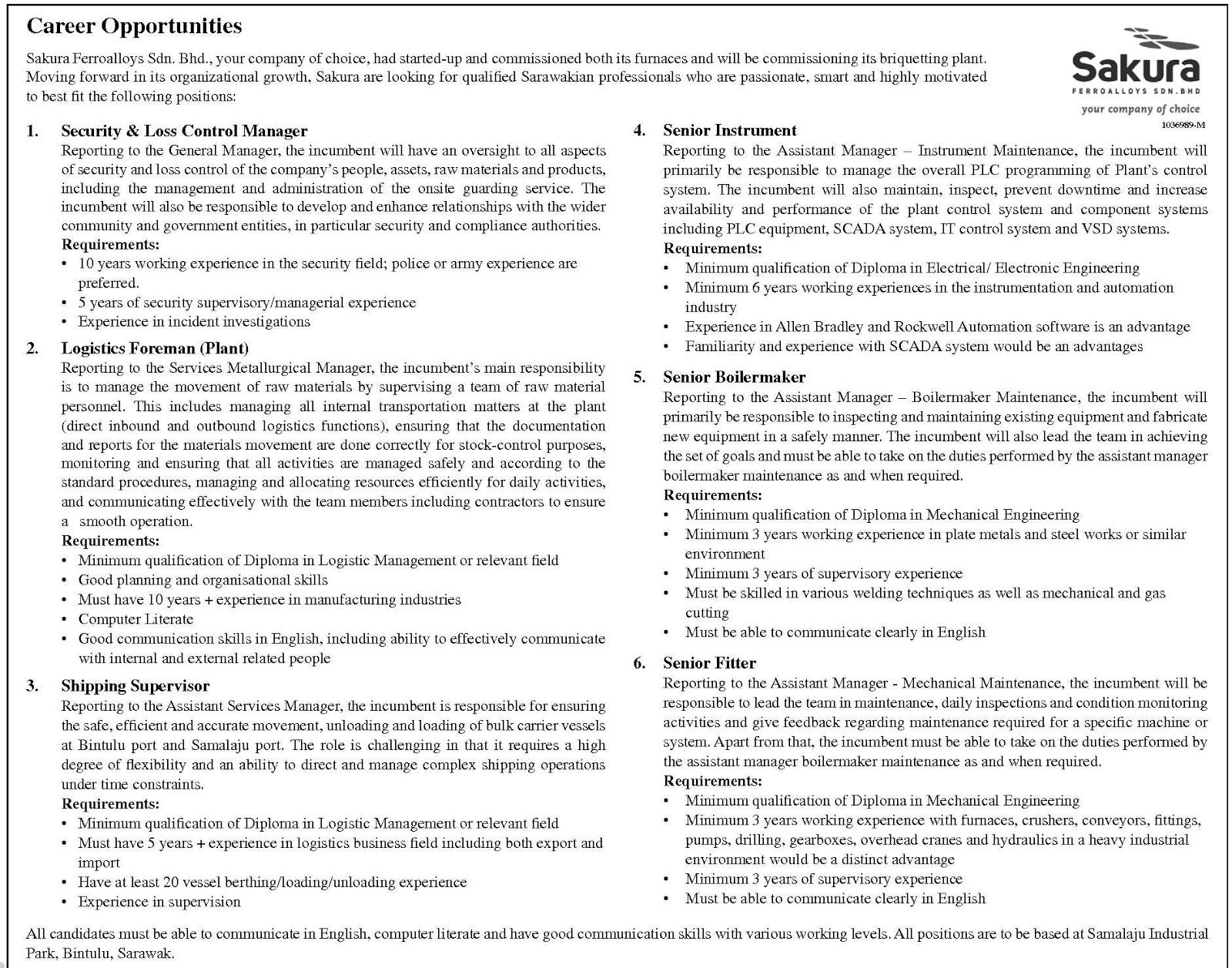 Oil Gas Vacancies Vacancies Sakura Ferroalloys Bintulu