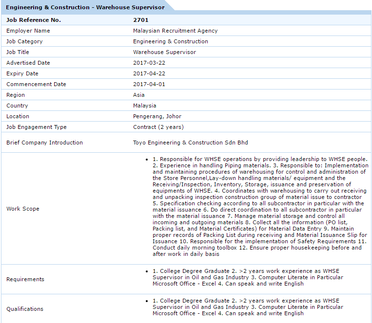 Oil Gas Vacancies Warehouse Supervisor Toyo Engineering Construction Sdn Bhd Pengerang